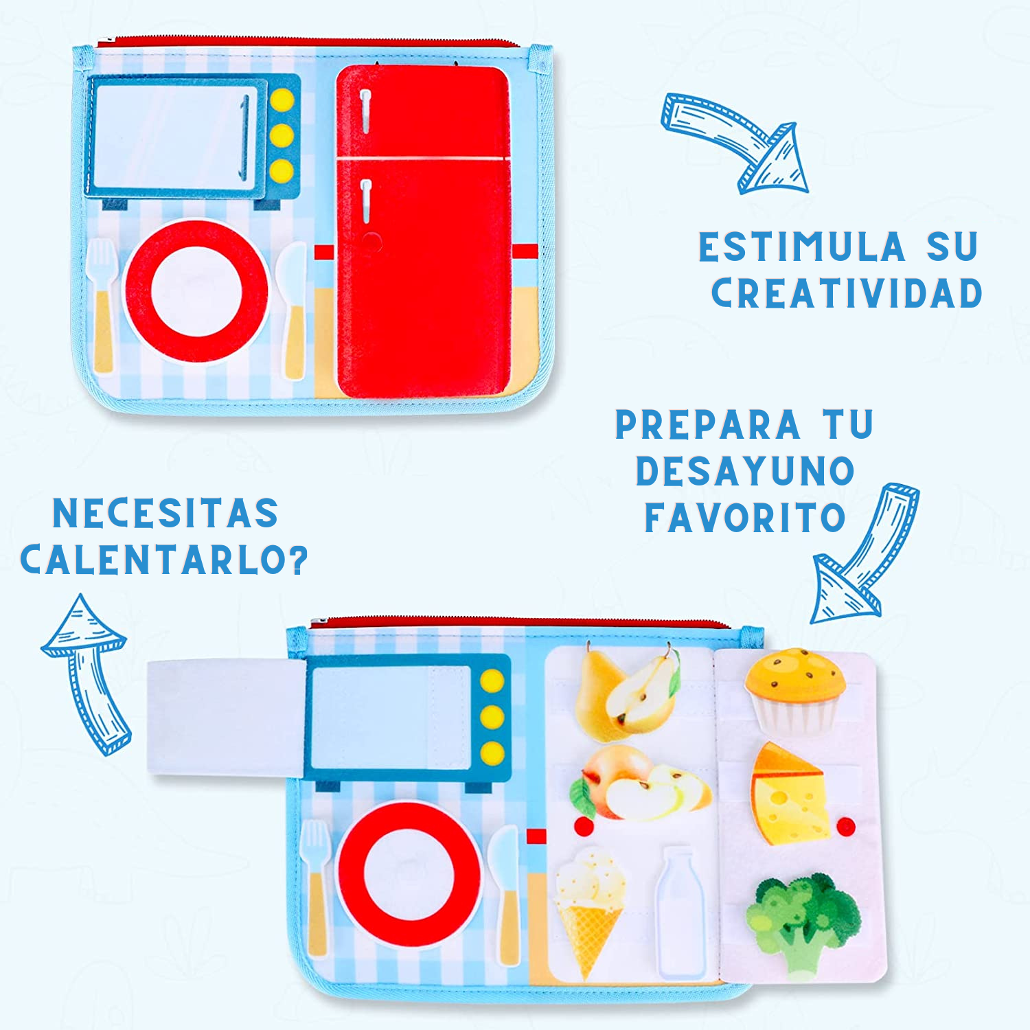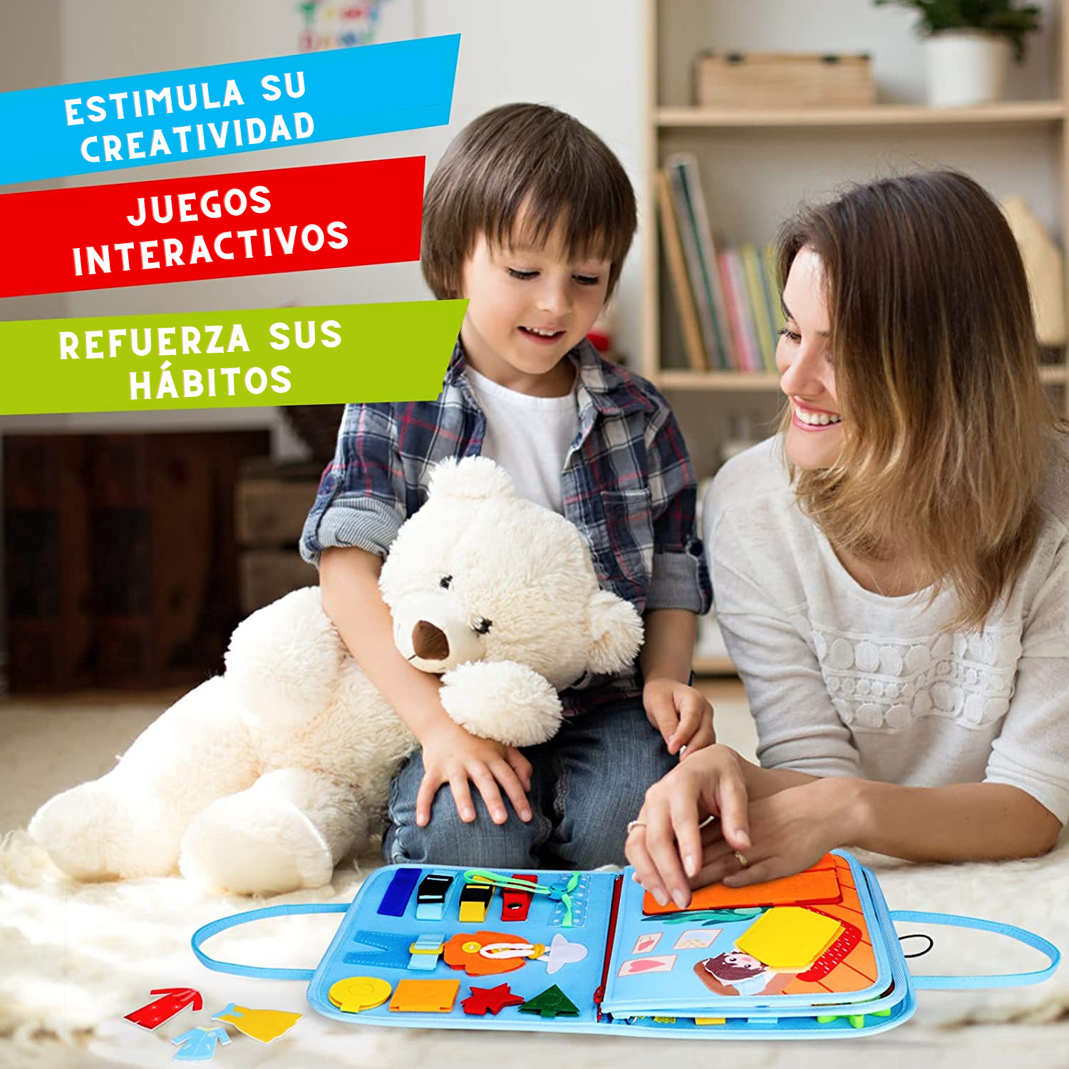 Con botones, cerraduras, cierres y hebillas para manipular, los niños pueden mejorar su destreza y coordinación ojo-mano.