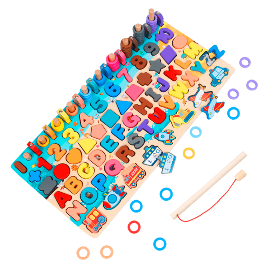 Nuestro Tablero Montessori 6 en 1 abarca una gama diversa de aprendizaje, desde el reconocimiento de números y colores hasta conceptos como medios de transporte, números, figuras geométricas, conteo, abecedario y pesca. Cada actividad está diseñada para captar la imaginación y el interés de tus pequeños exploradores.
